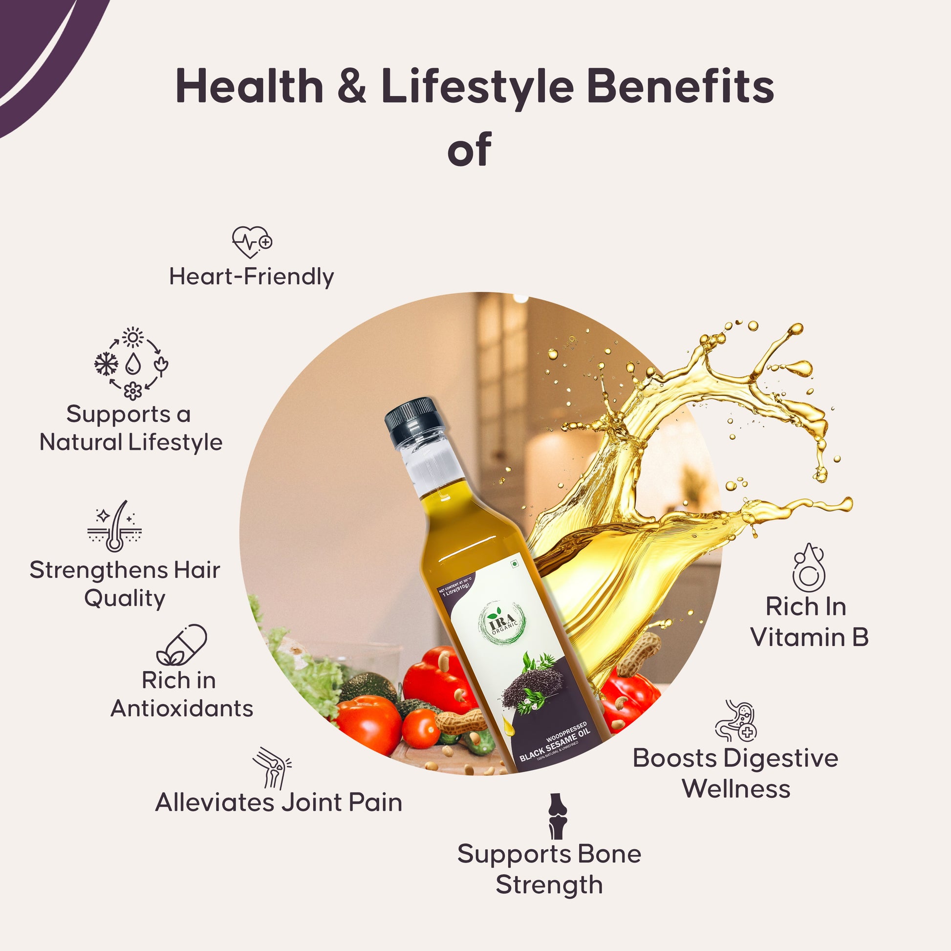 - HEALTH BENEFITS: It is high in monounsaturated fatty acid and polyunsaturated fatty acid, and it can reduce the risk of heart disease. Omega-3 and omega-6 fatty acids are plentiful in IraOrganic Woodpressed Black Sesame oil and are crucial for the growth and development of the brain. Improves Skin Health, Boosts Immunity, and Reduces Inflammation are some other benefits.